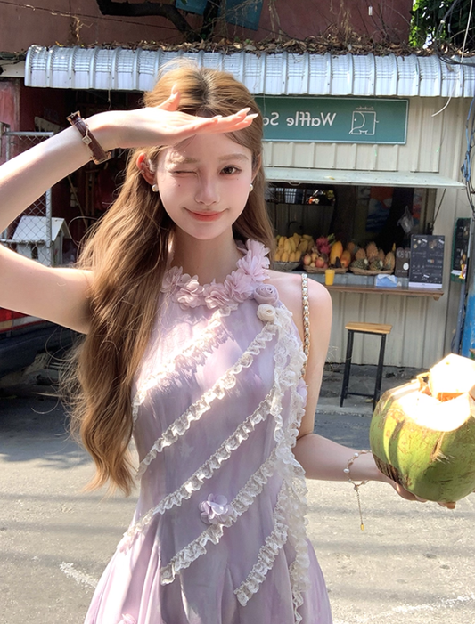 Purple long halter neck dress summer French retro slim fit temperament skirt R4623