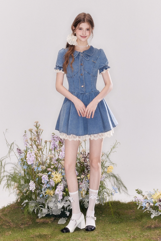 Vintage denim dress with baby doll collar, puff sleeves and waist-hugging tutu skirt R4543