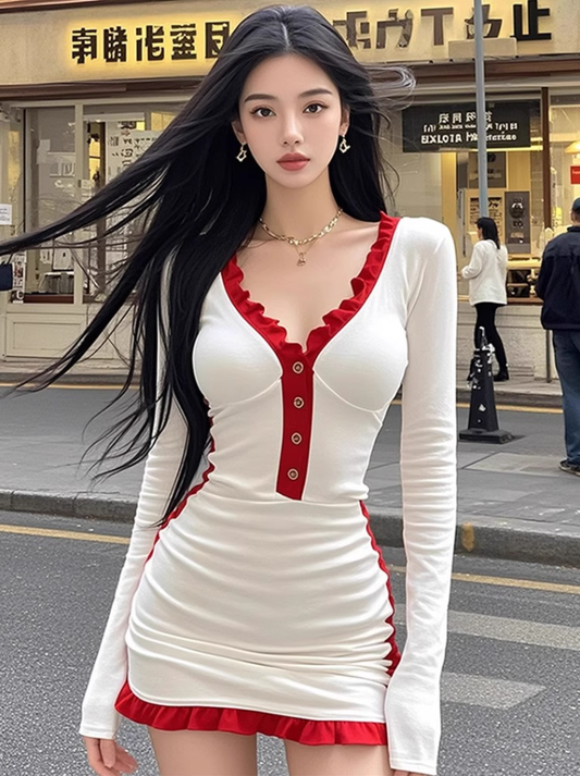 Design sense V-neck ruffled contrast color long-sleeved dress 2025 waist hip skirt R1244