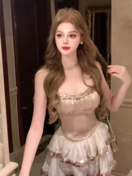 Sequined short camisole top 2025 pure desire puffy skirt suit R1216