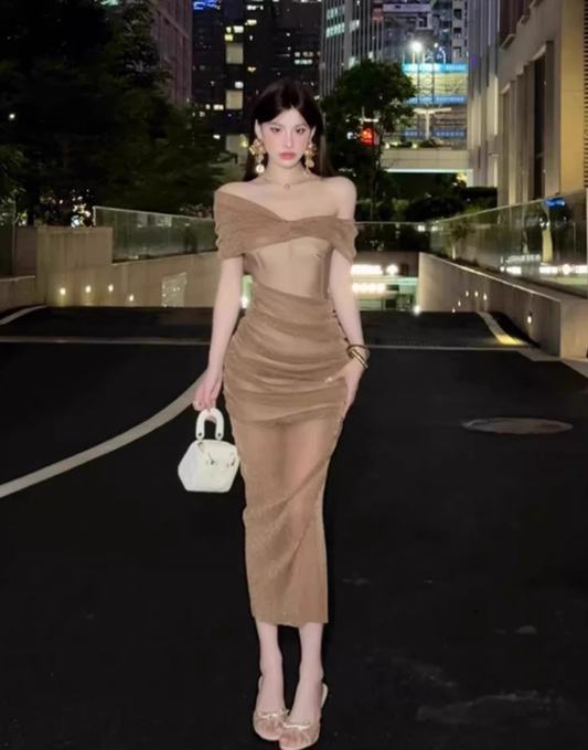 French high-grade mesh one-shoulder dress 2025 pleated waist hip skirt R1222