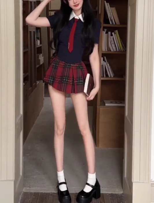 College style short embroidered shirt 2025 sweet and spicy plaid pleated skirt suit R1180