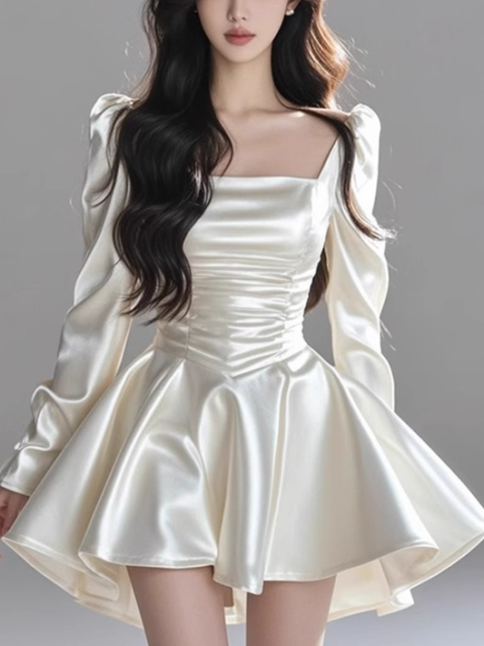 High-end light luxury square neck long-sleeved satin dress 2025 waist A-line dress R1157