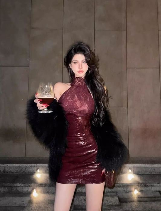 Sexy hot girl lace splicing halter neck dress 2025 pure desire waist hip skirt R1155