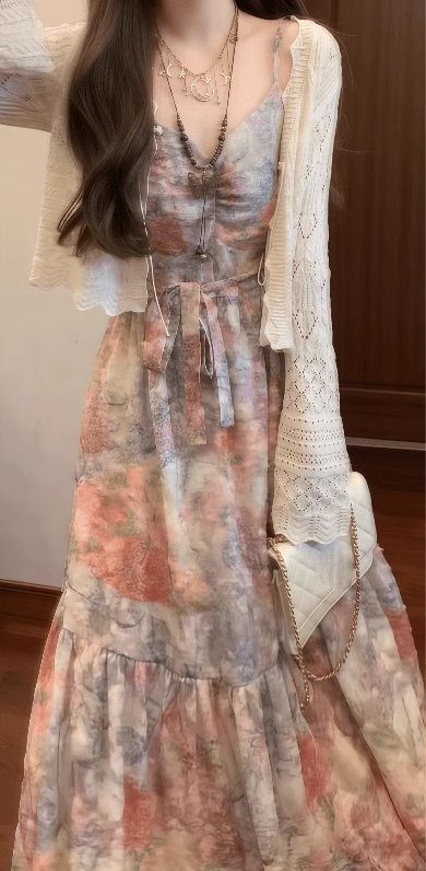 Retro floral suspender dress gentle temperament waist A-line long skirt R0785
