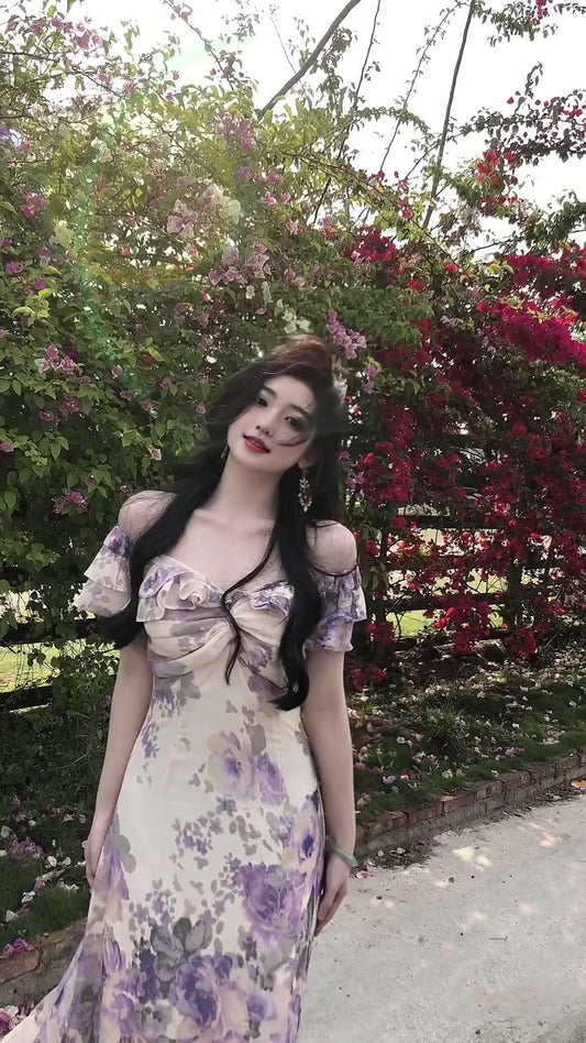Purple V-neck floral one-shoulder dress gentle temperament waist A-line long skirt R0776