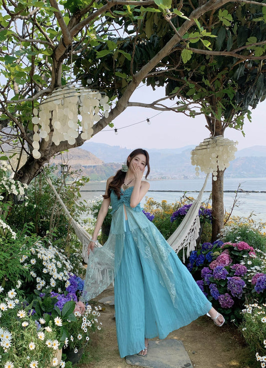 Beautiful little skirt lace splicing cake sling long dress R0778