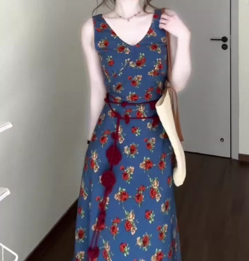 Retro V-neck floral suspender dress high-end waist temperament long skirt R0772