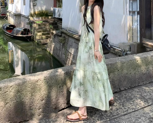 Ink painting halter neck dress seaside holiday style retro cool temperament skirt R0765
