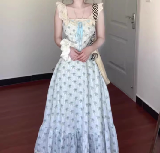 Blue floral dress gentle temperament beautiful summer skirt R0762