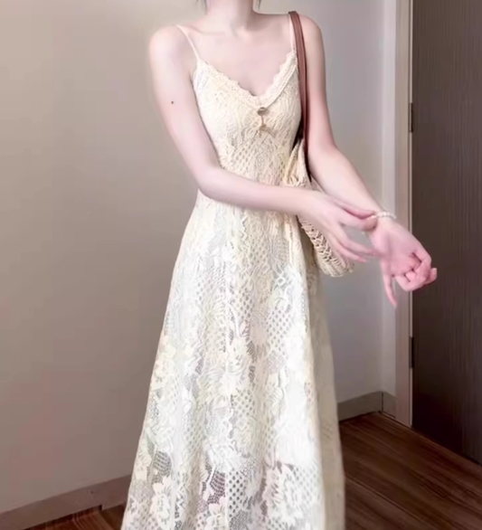 Retro v-neck hollow suspender dress niche waist temperament long skirt R0679
