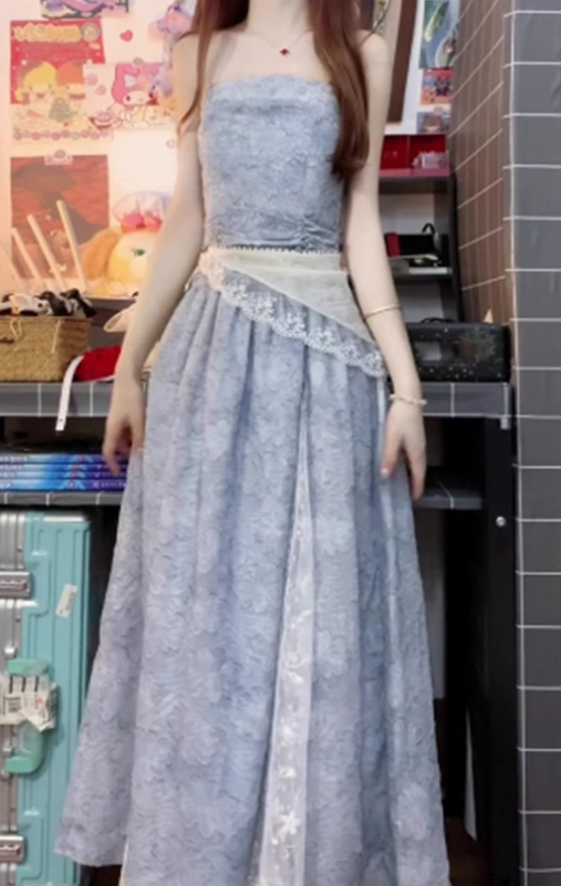 Blue lace tube top dress 2025 new beautiful waist a-line long skirt R0675