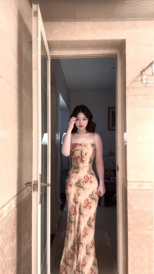 Floral suspender dress beautiful figure showing beautiful slim temperament long dress R0672