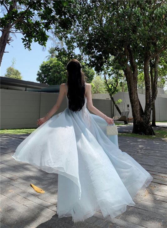 Blue V-neck suspender dress beautiful gentle temperament small skirt R0669