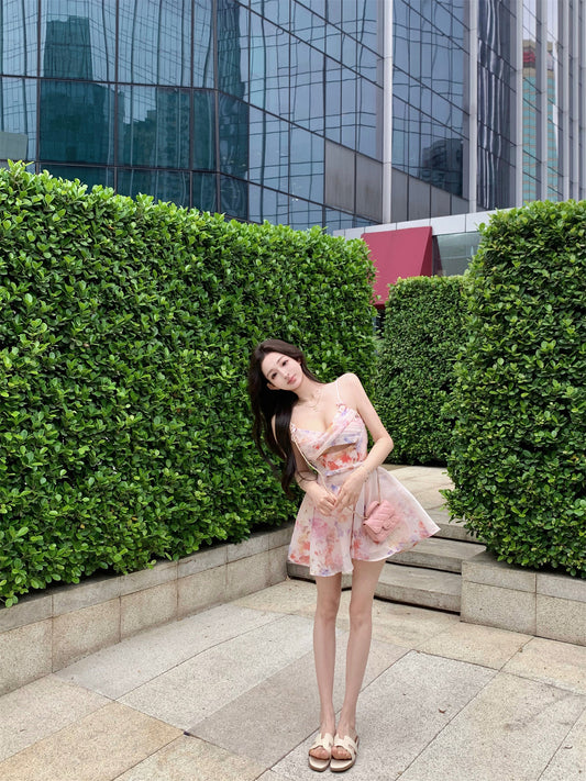 V-neck floral dress with hollow suspenders, beautiful small skirt R0586