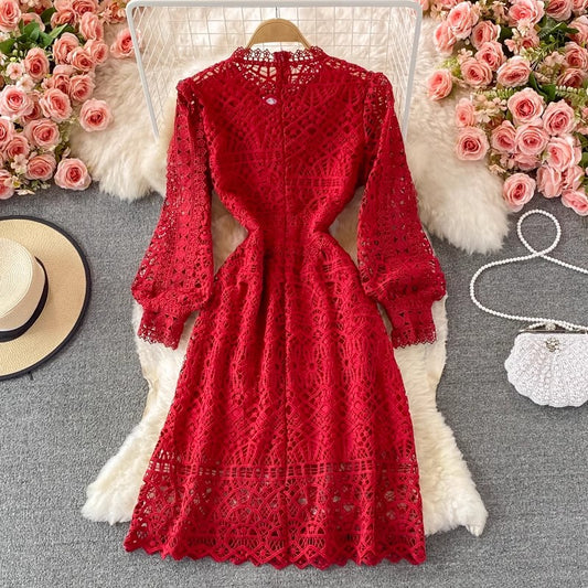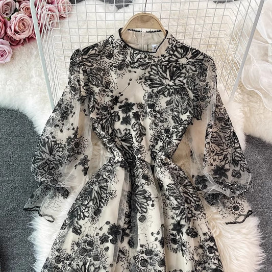 embroidered mesh dress, lantern sleeves, knee-high A-line skirt S3886