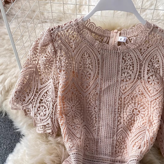 new women's fashion dress round neck short-sleeved lace skirt S3893