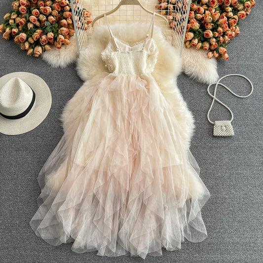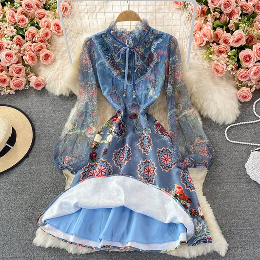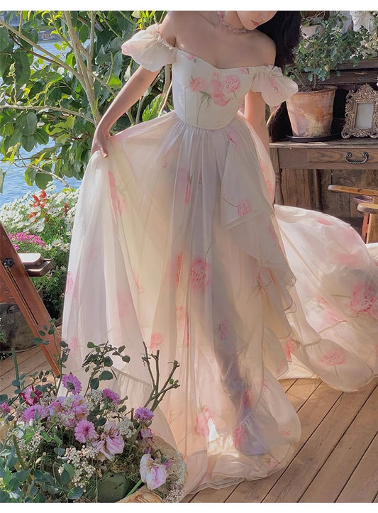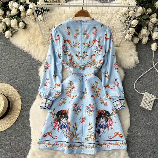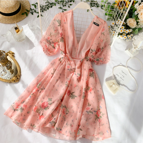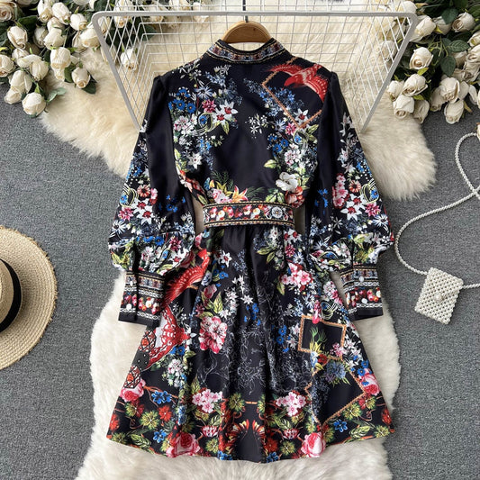 Puff sleeve floral dress women's summer and early autumn long skirt S3428