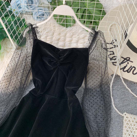 Black velvet short dress black fashion dress S39
