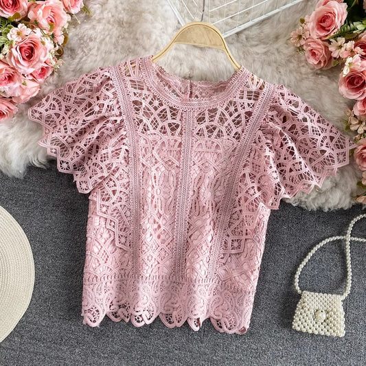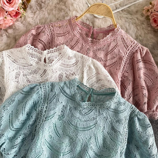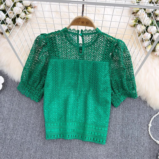 Puff-sleeved lace shirt short-sleeved solid color short top for women S3898