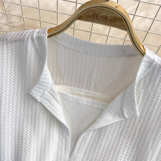Solid Color Short Top Short Sleeve Round Neck Lace Shirt for Women S3941