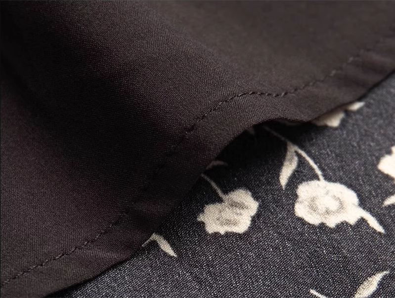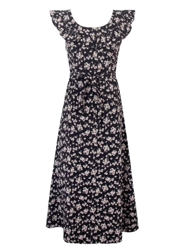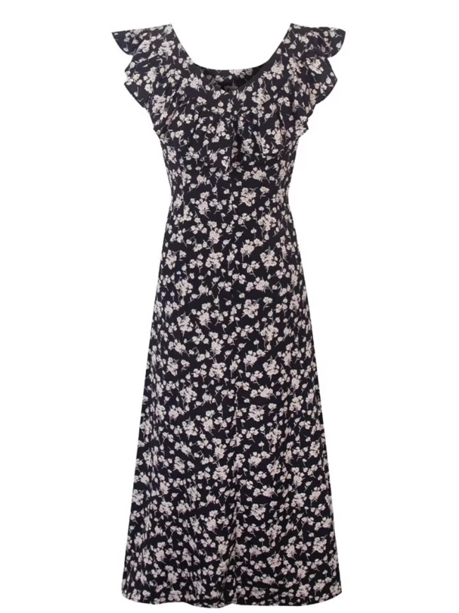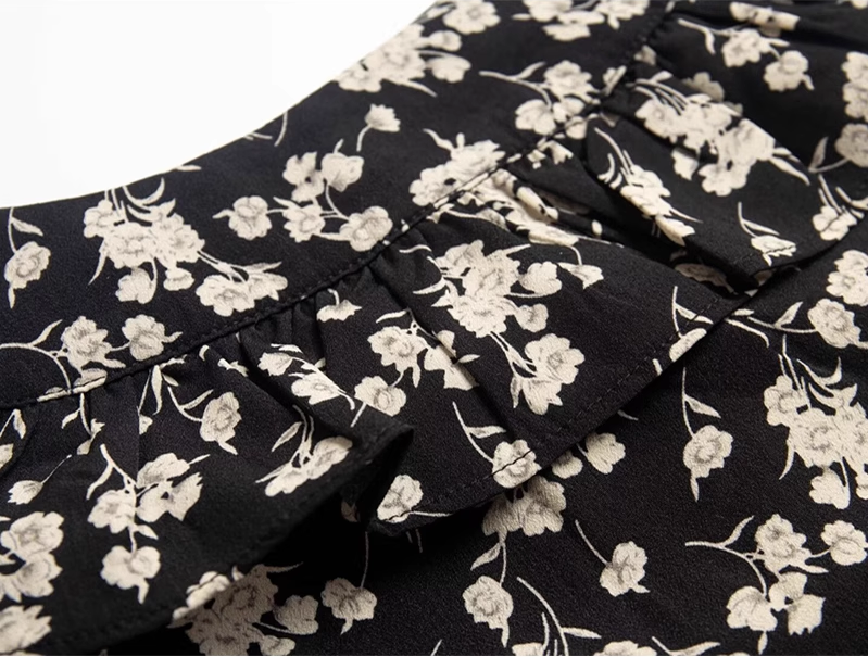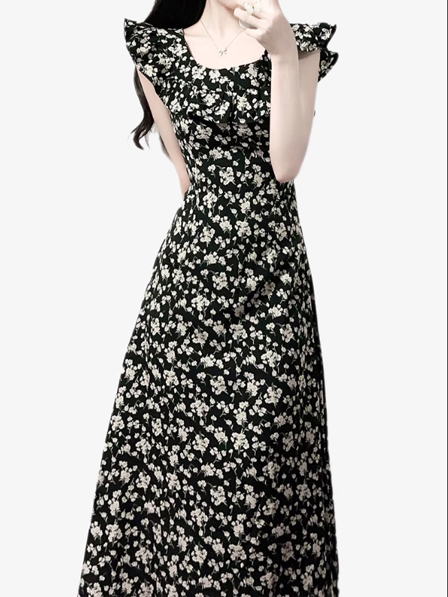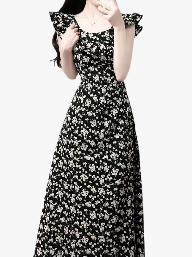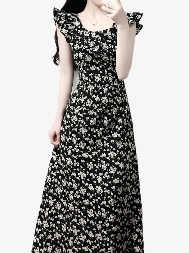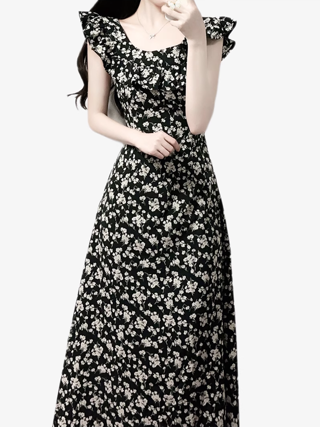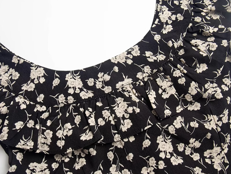 2025 Summer New French Black Floral Ruffled Medium Length Square Neck Dress R0914