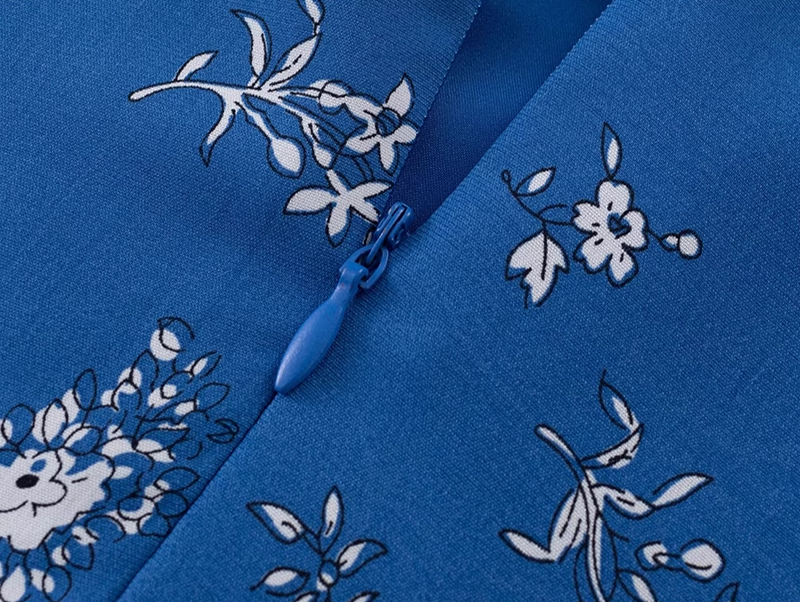 2025 Summer New Retro Blue Floral Ruffle Waist V-Neck Holiday Dress R0976
