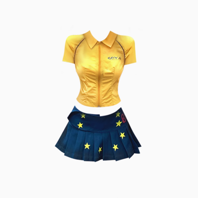 American retro bright yellow short-sleeved shirt 2025 pleated printed skirt suit R1308