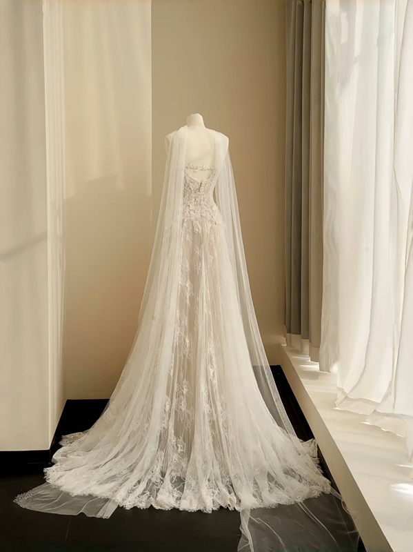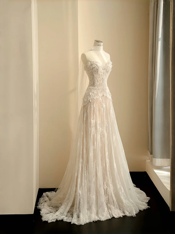 Apricot lace tube top slim waist A-line maxi skirt, prom dress R5673