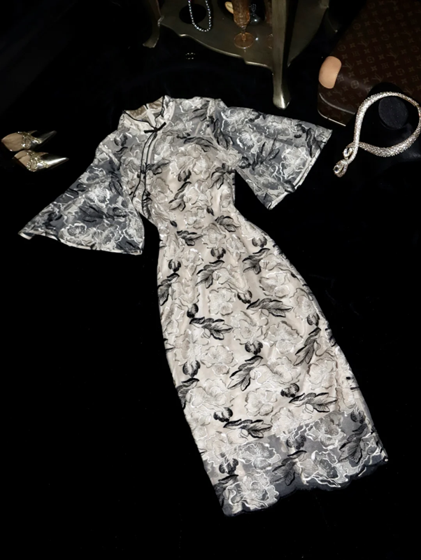 Apricot-lined midi ball gown with black floral embroidery R6852