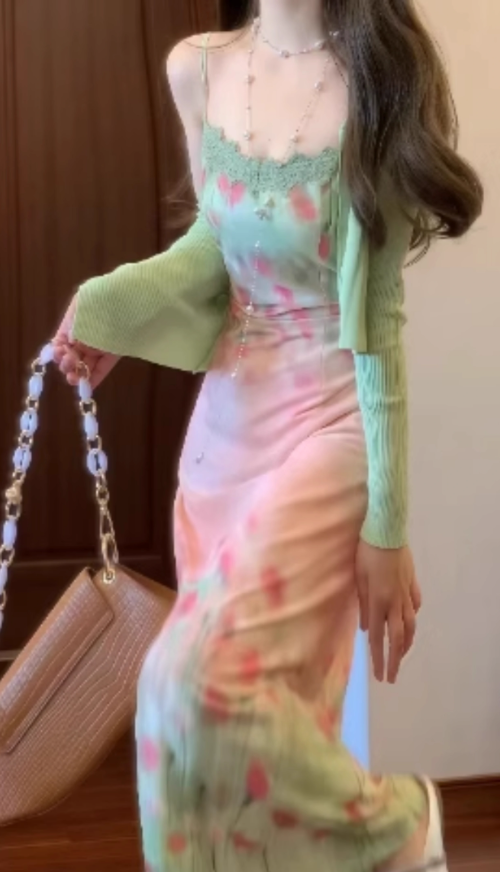 Beautiful little skirt gentle temperament green floral suspender dress R0683