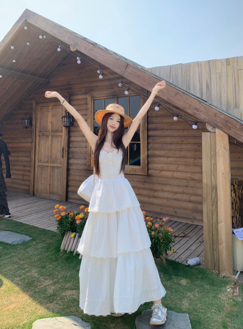 Beautiful little skirt lace splicing cake sling long dress R0778