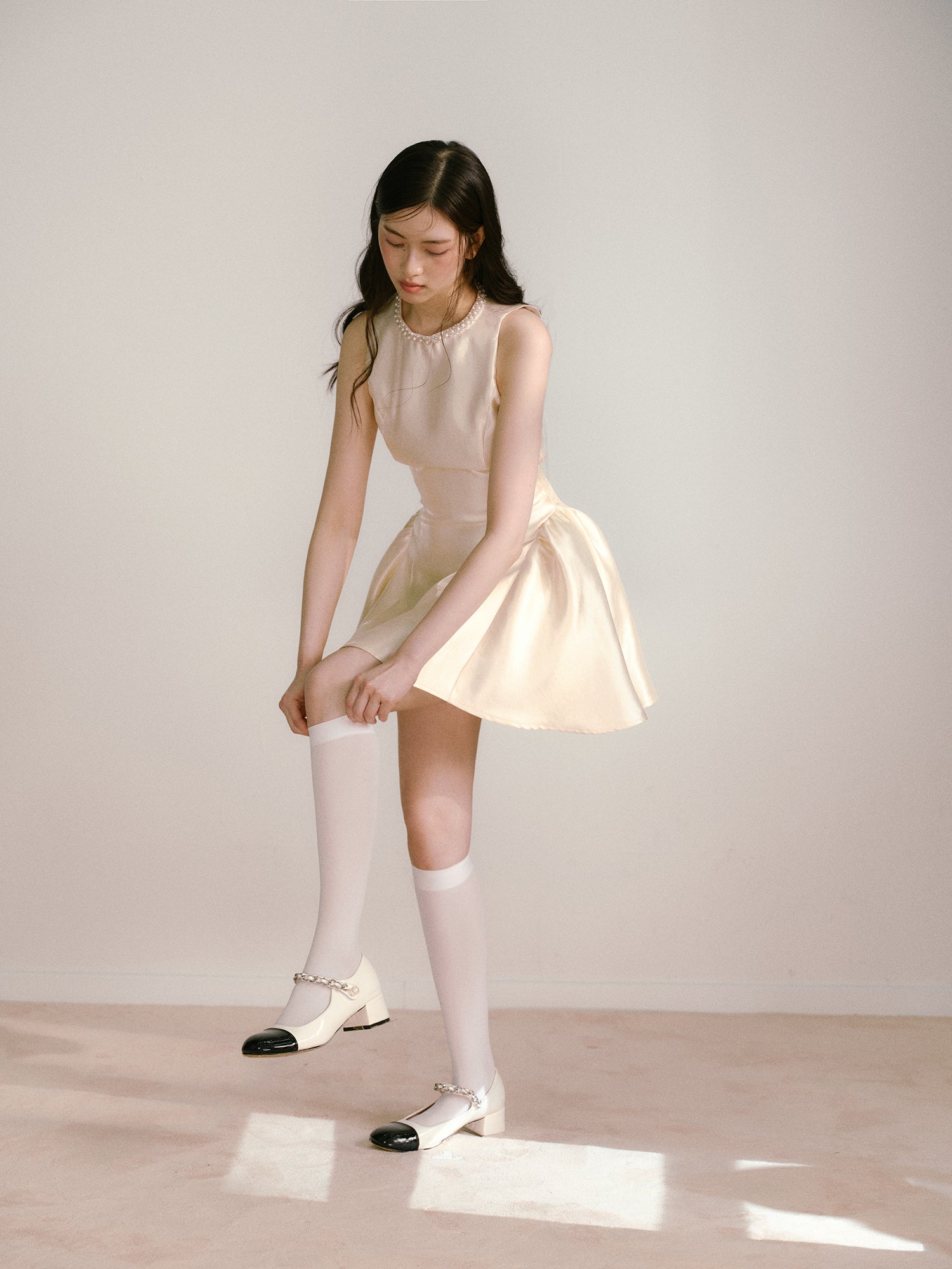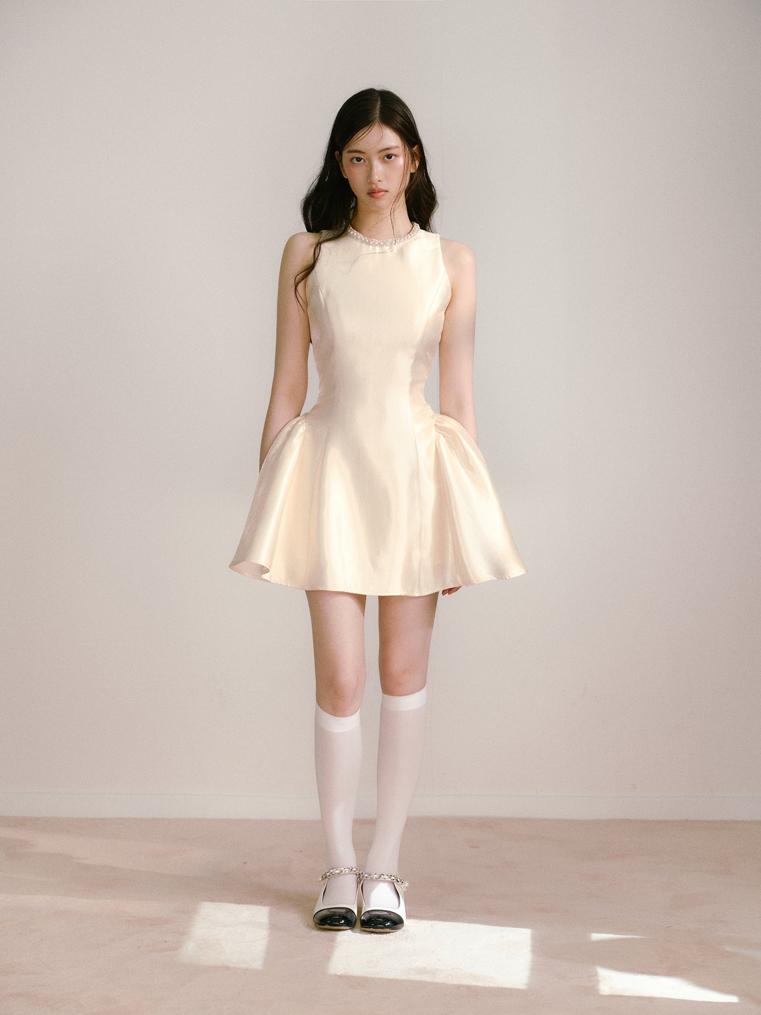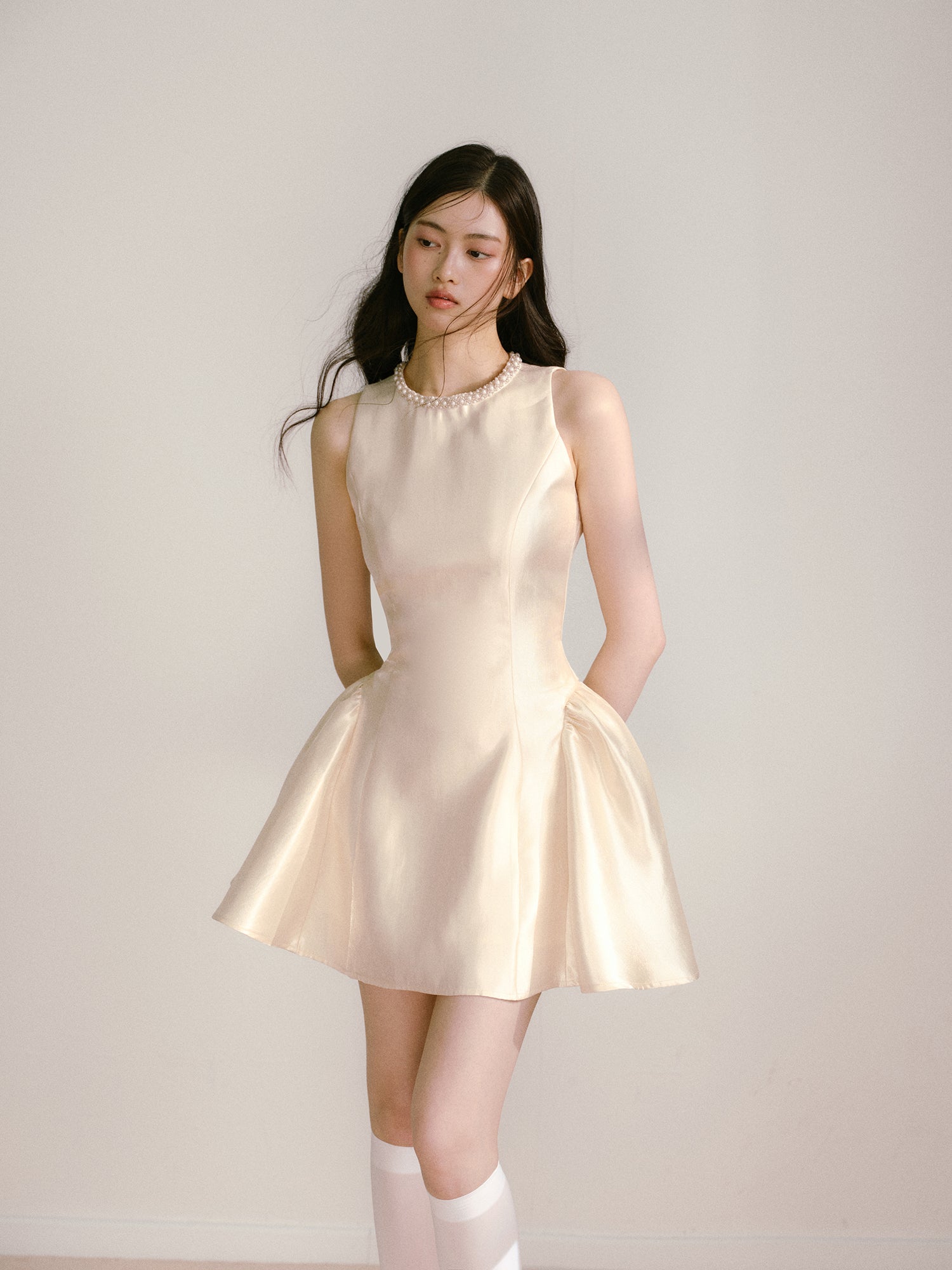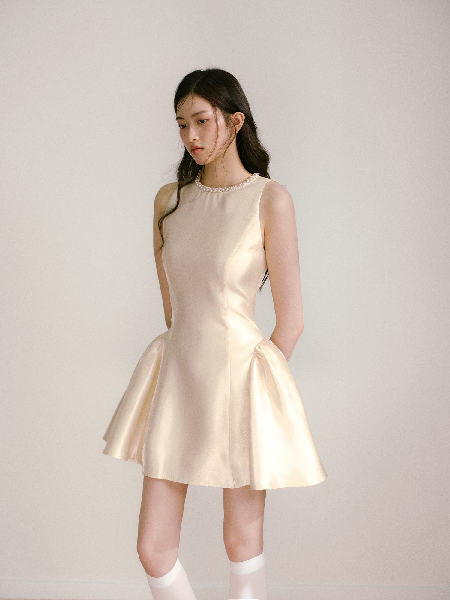 Beige glossy satin 3D handmade pearl princess skirt puffy dress R5133