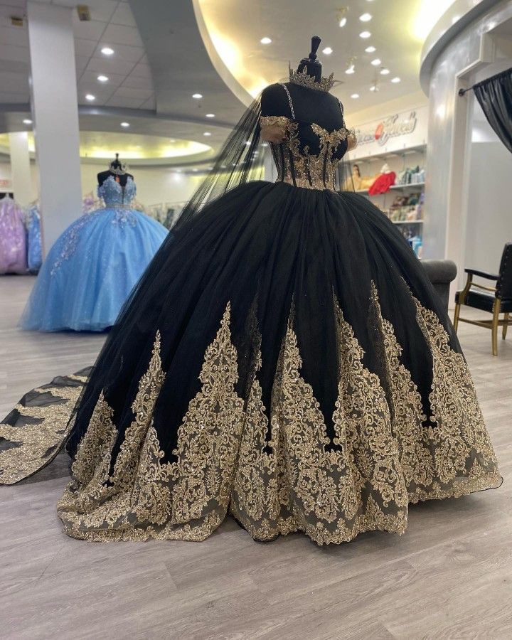 Black Gold Appliques Tulle Quinceanera Dresses With Cape Spaghetti Straps Ball Gown Sweet Sixteen Prom Party Dresses S7165