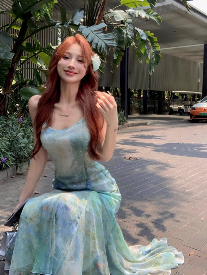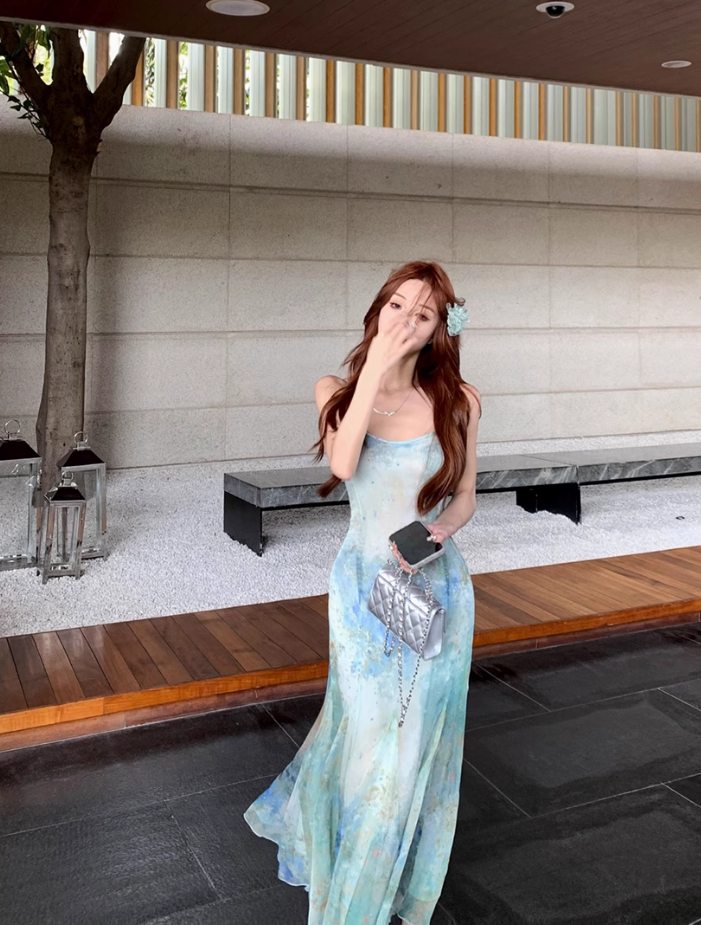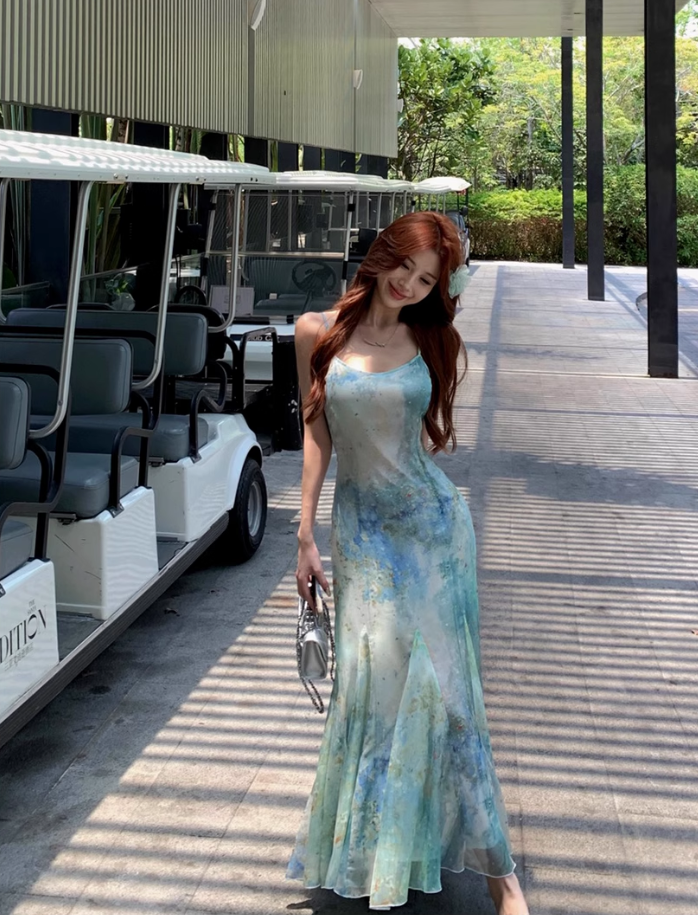 Blending fishtail skirt waist slimming princess holiday suspender dress long skirt R1737