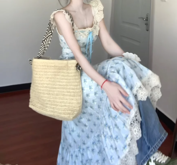 Blue floral dress gentle temperament beautiful summer skirt R0762