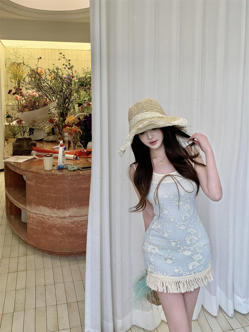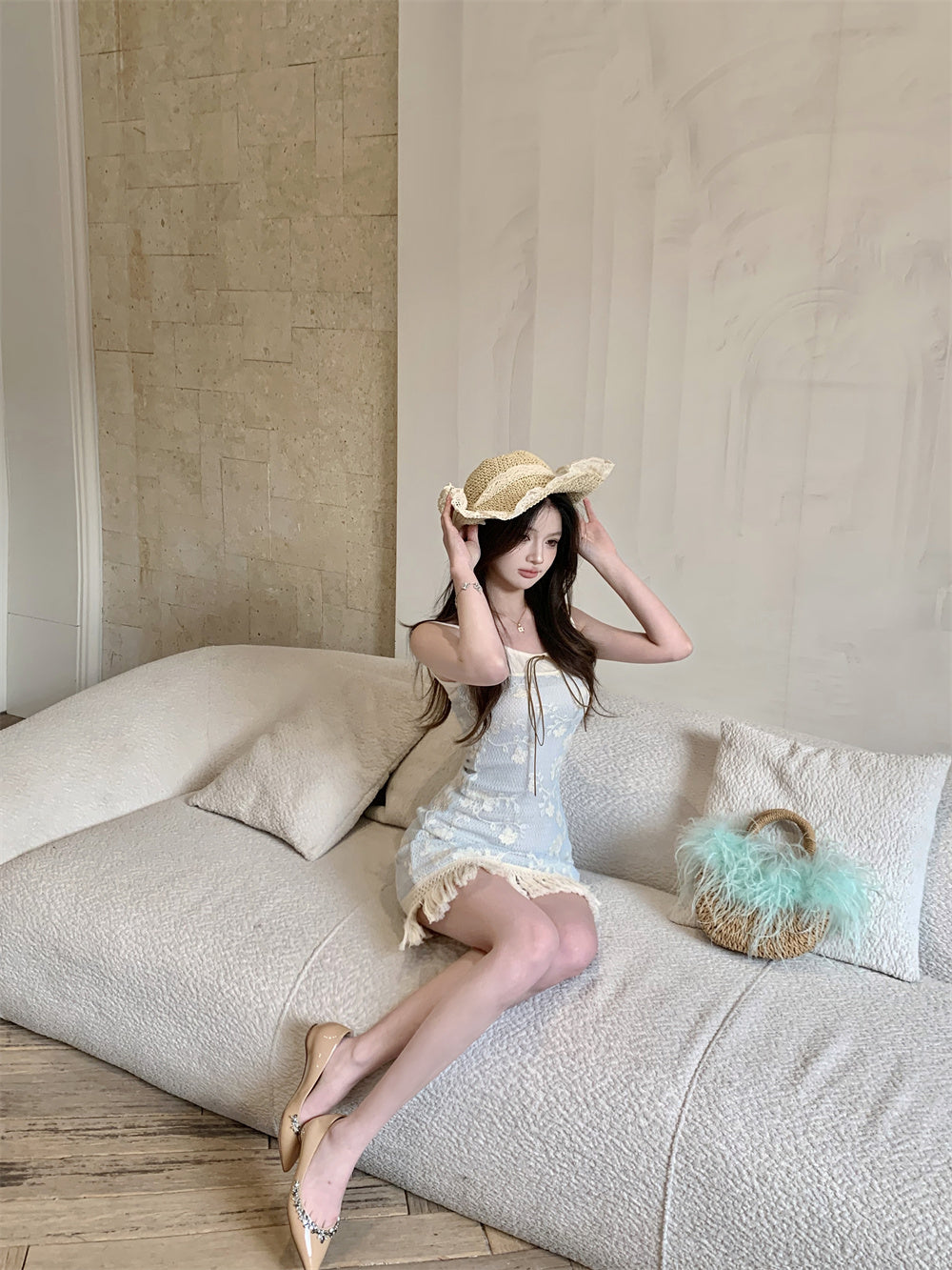 Blue jacquard suspender dress two-piece set beautiful waist slim hip skirt R0564
