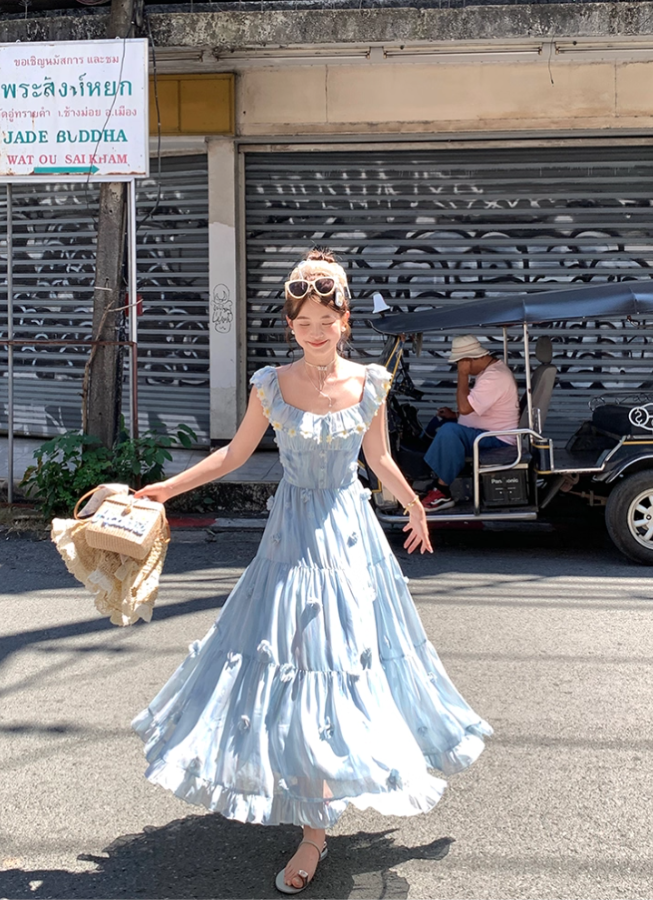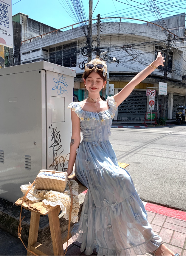 Blue long chiffon printed small flying sleeve suspender dress summer French sweet slim skirt R4616