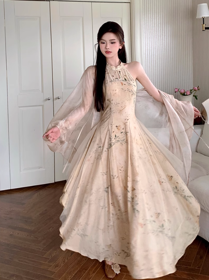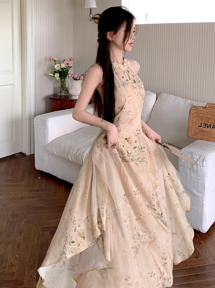 Fairy new Chinese style improved cheongsam halo dyed floral waist long skirt dress R1703