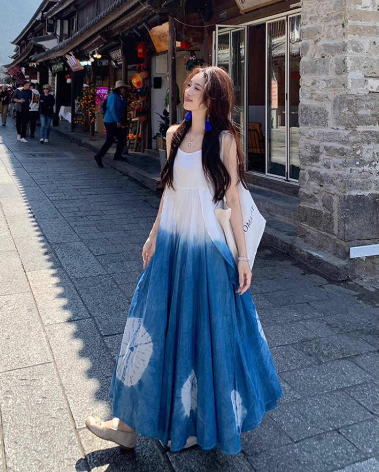 Fairy ruffle blue tie-dye color matching long skirt travel wear suspender dress R1712
