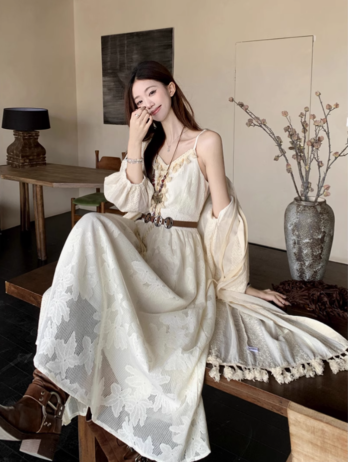 Fairy travel outfit V-neck suspender embroidered long skirt tassel sunscreen cardigan two-piece suit R1728