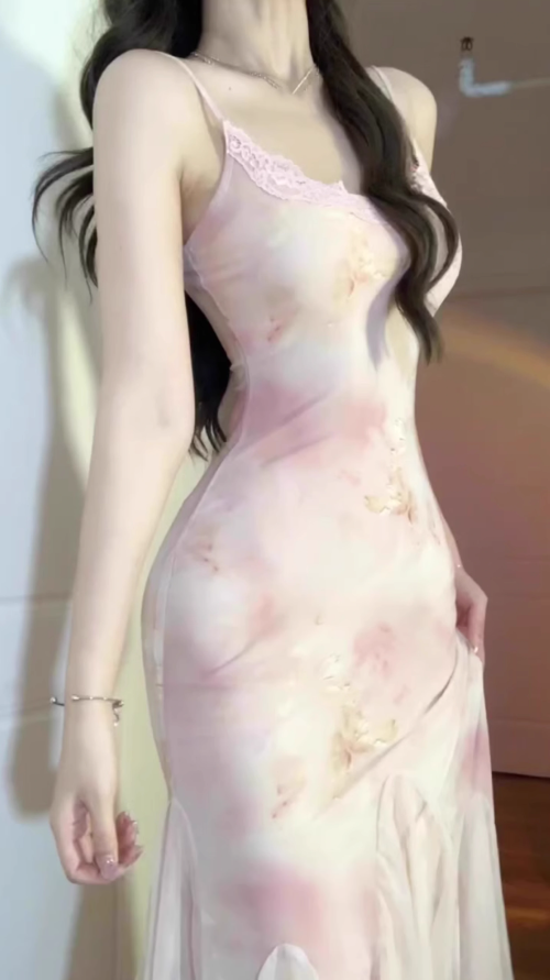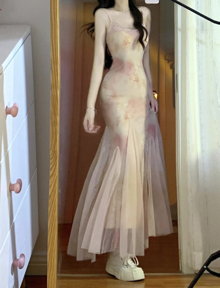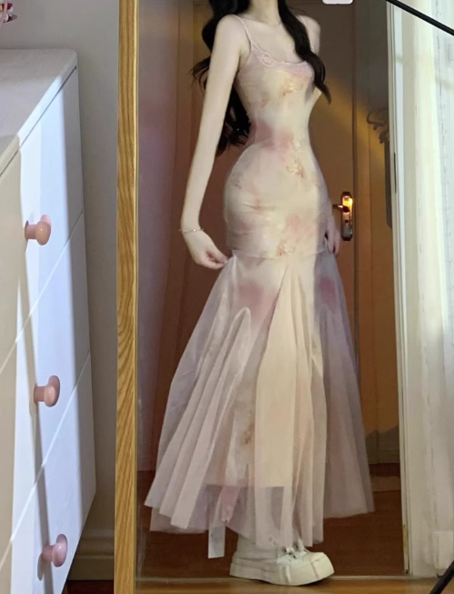 Floral suspender dress, gentle temperament, beautiful waist, slim fit, hip skirt R0588