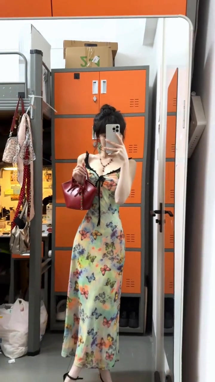 Floral suspender dress with gentle temperament, slim waist and hip skirt R0574