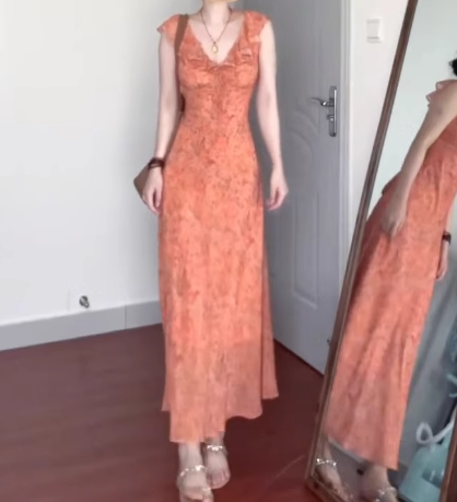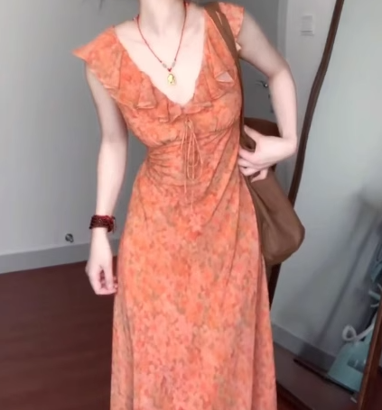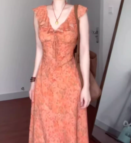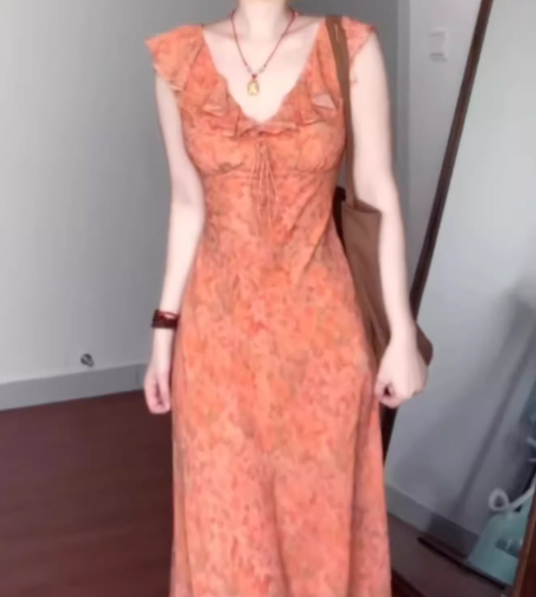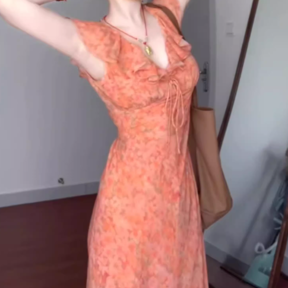Floral suspender skirt niche design flying sleeves v-neck waist beautiful dress R0775