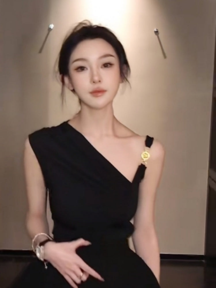 French black off-shoulder irregular pleated vest top bud skirt two-piece homecoming dress R3024