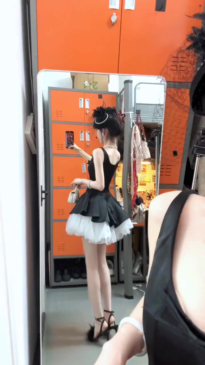 French black suspender dress retro temperament waist fluffy mesh dress R0885