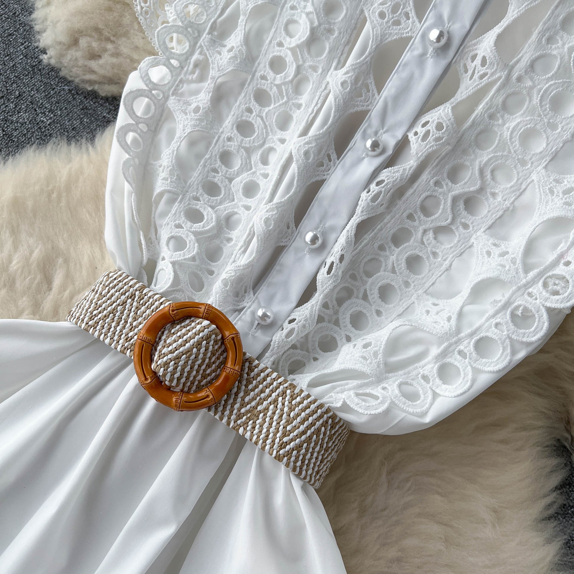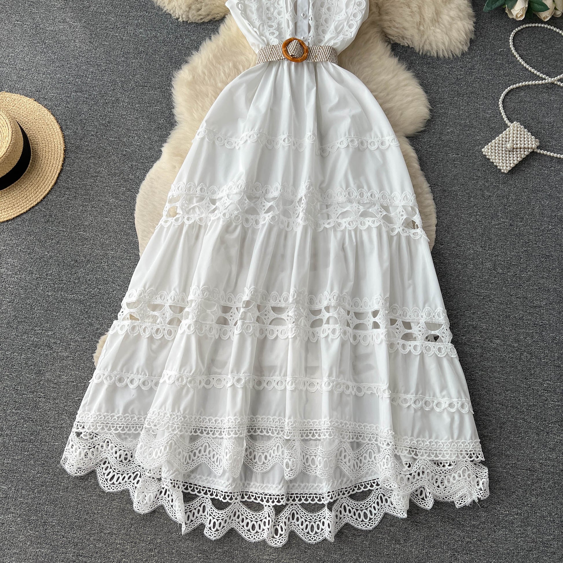 French high-end stand-up collar hollow embroidered lace sleeveless waist slimming elegant dress R2159