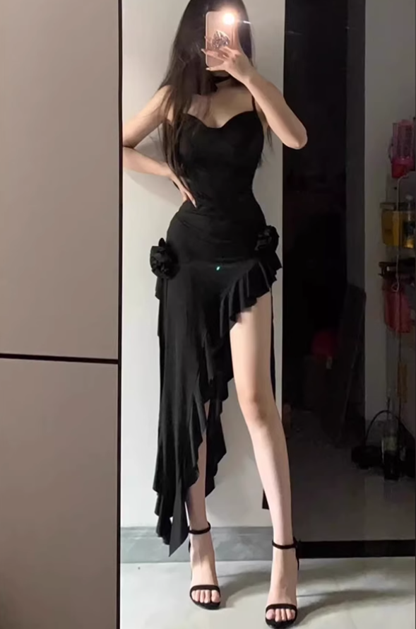French pure desire ruffled suspender dress plus size sexy hot girl irregular slit hip skirt R1839