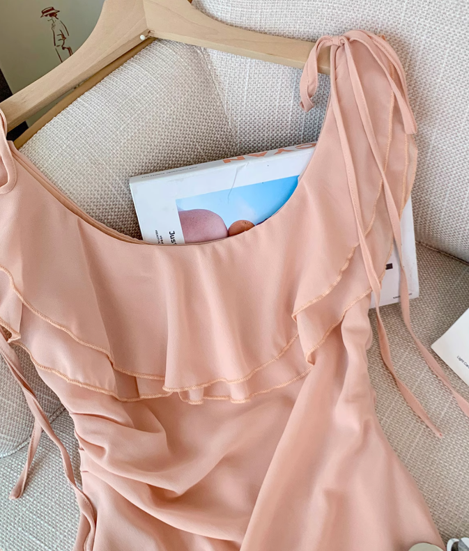 French ruffled large U-neck dress for women new style pleated gentle style short A-line skirt R4032