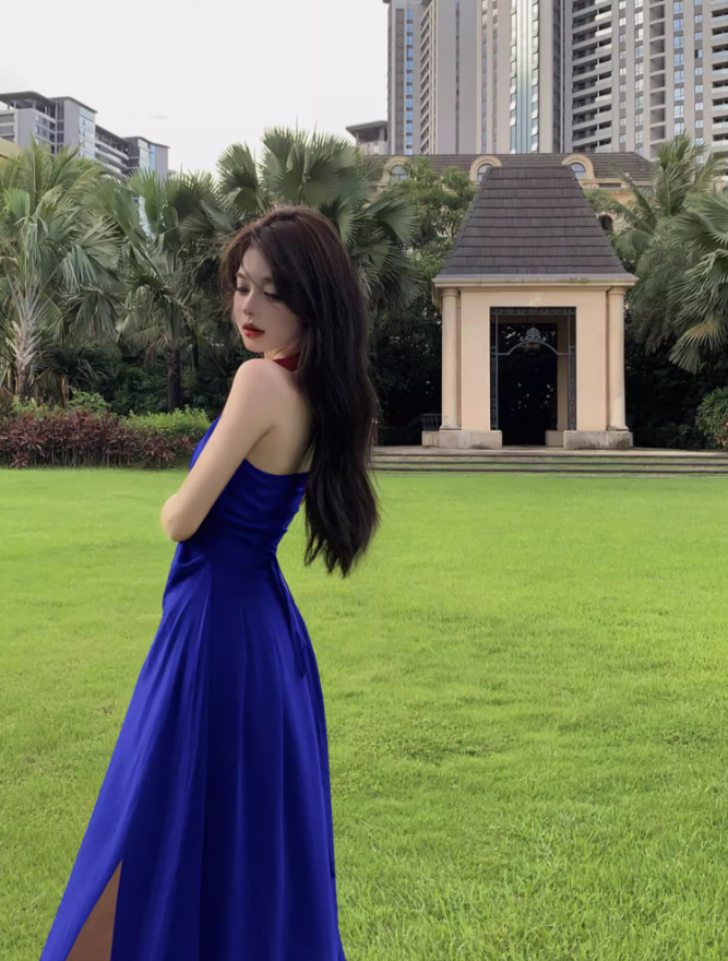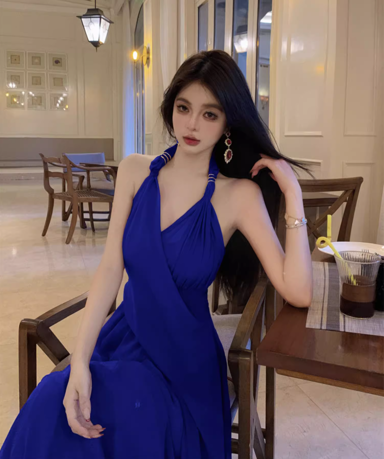 French seaside holiday long dress, temperament and slim red v-neck halter neck drape dress R1600